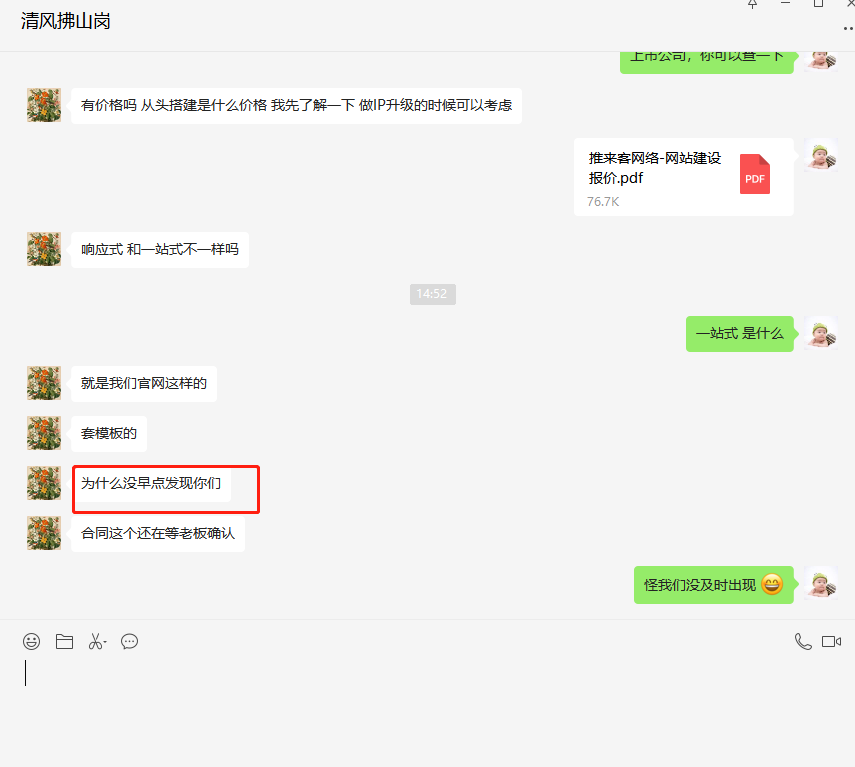 客户找到我们并不是做网站的,而是咨询网站LOGO权益开通问题,后面看见我们网站做的效果还不错,顺便了解了我们的网站建设模式和流程。后面也给客户发了我们的功能,客户表示:没早点发现我们,并表示后期网站IP升级的时候找我们。