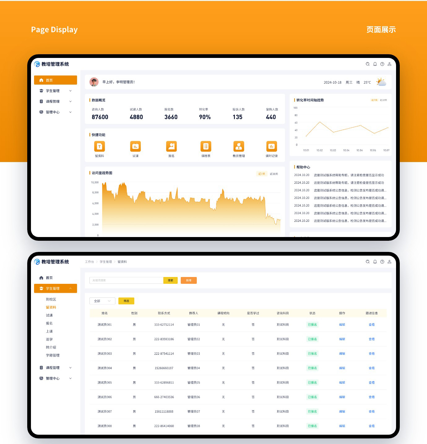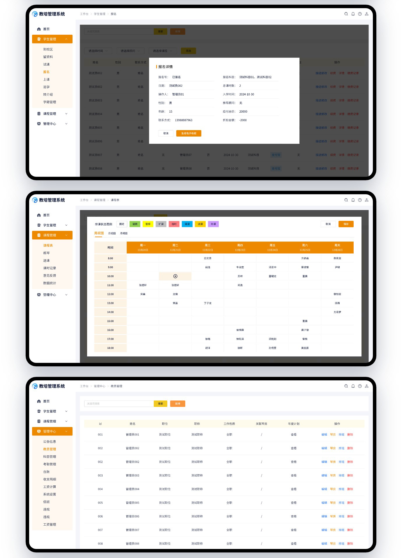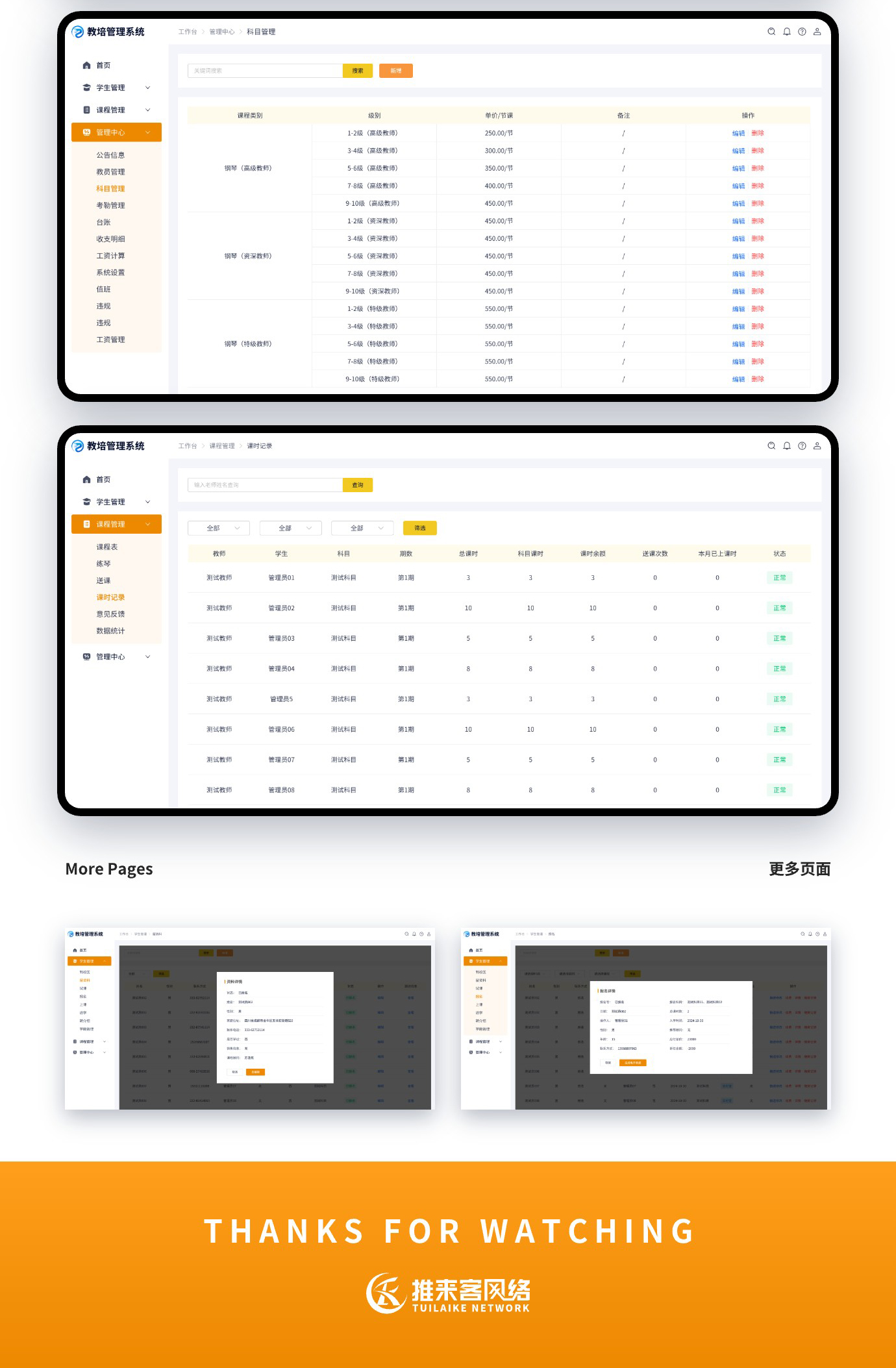 这是我们给广东以为客户开发的教培管理系统,功能不算复杂,常规的排课系统、财务管理、人事管理、资料管理、学籍管理、课程管理都是有的。目前第一阶段只开发了PC管理端,如果运营能达到预期会进入第二期小程序端或者APP端开发。