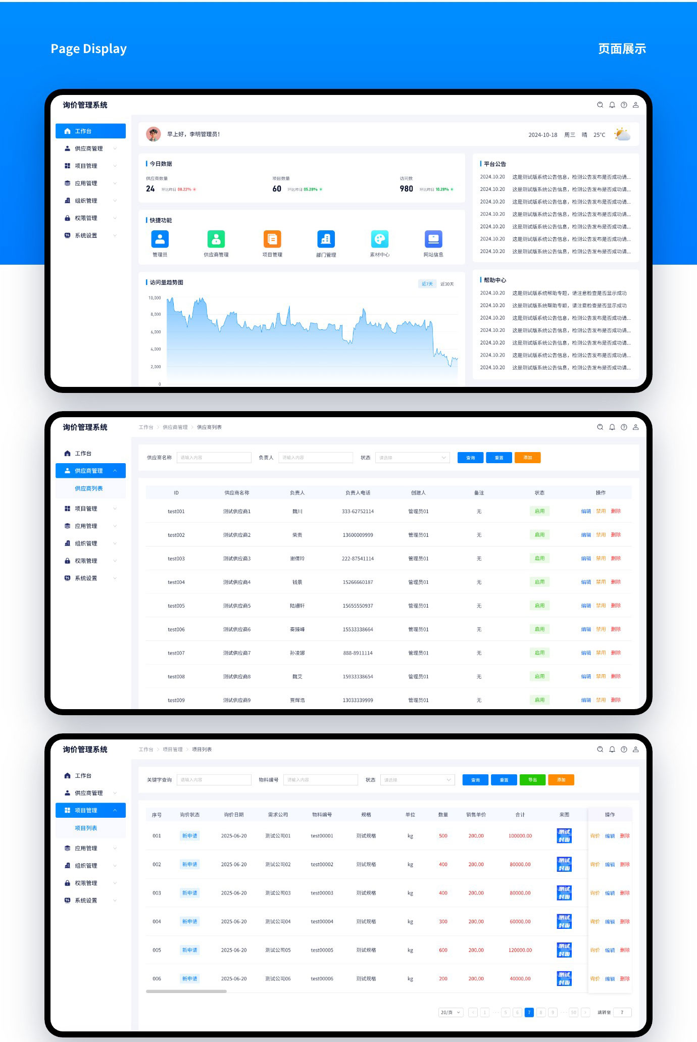 这是帮客户定制开发的一套询价管理系统,解决痛点问题1)供应商信息管理,要查自己想要的供应商联系方式,直接登录系统筛选即可,不会像以前到处找甚至时间长了就找不到了 2)针对询价专员进行了管理,必须在规定的时间内完成询价工作,否则视为不达标,不像之前一样行为懒散。对每一个项目的询价也一目了然。