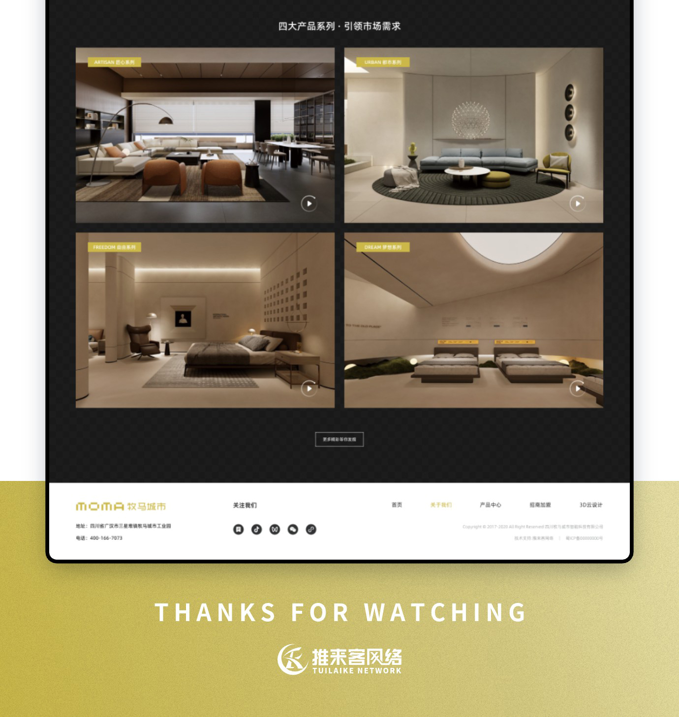 高端家具公司牧马城市(moma city),一个更懂舒适生活的现代智能家居品牌。在大街和楼房,牧马城市了解你的脆弱和迷惘,在无尽城市的钢铁丛林中,纵使无数灯光汇聚成一片星海,牧马城市也只为你点亮一盏专属的灯火。